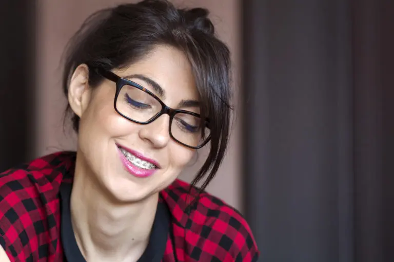 A woman with dark hair, glasses, and braces—smiling and looking down in a red and black plaid shirt—represents a happy patient at Andros Orthodontics in Pasco, WA.